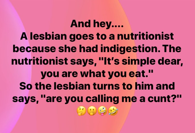 A lesbian goes to a nutritionist because she had indigestion. The nutritionist says, "It’s simple dear, you are what you eat." So the lesbian turns to him and says, "are you calling me a cunt?"