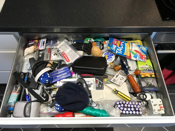 Everyoneβs got a βstuffβ drawer!...... ......and ours in the kitchen has all the required contents....like superglue, bluetac, string, batteries, birthday cake π candles.....and even a shell π. And this is it after a recent βcrap-cullβ π€£π€£ βBut Not Big To Dinosaursβ......where the βcrap-cullβ stuff Β now resides! ππ€£π€£π¦π¦ππ€ http://www.austinmacauley.com/book/not-big-dinosaurs